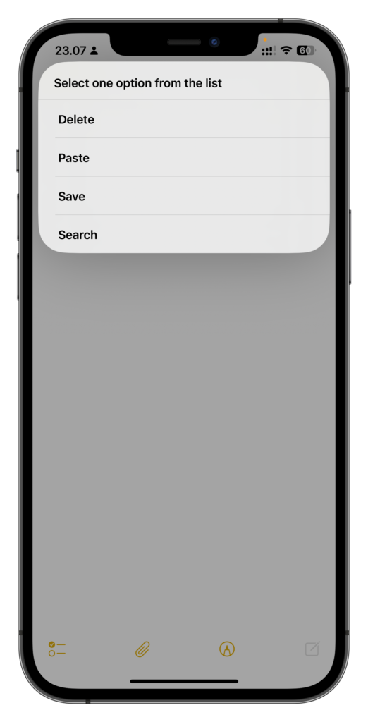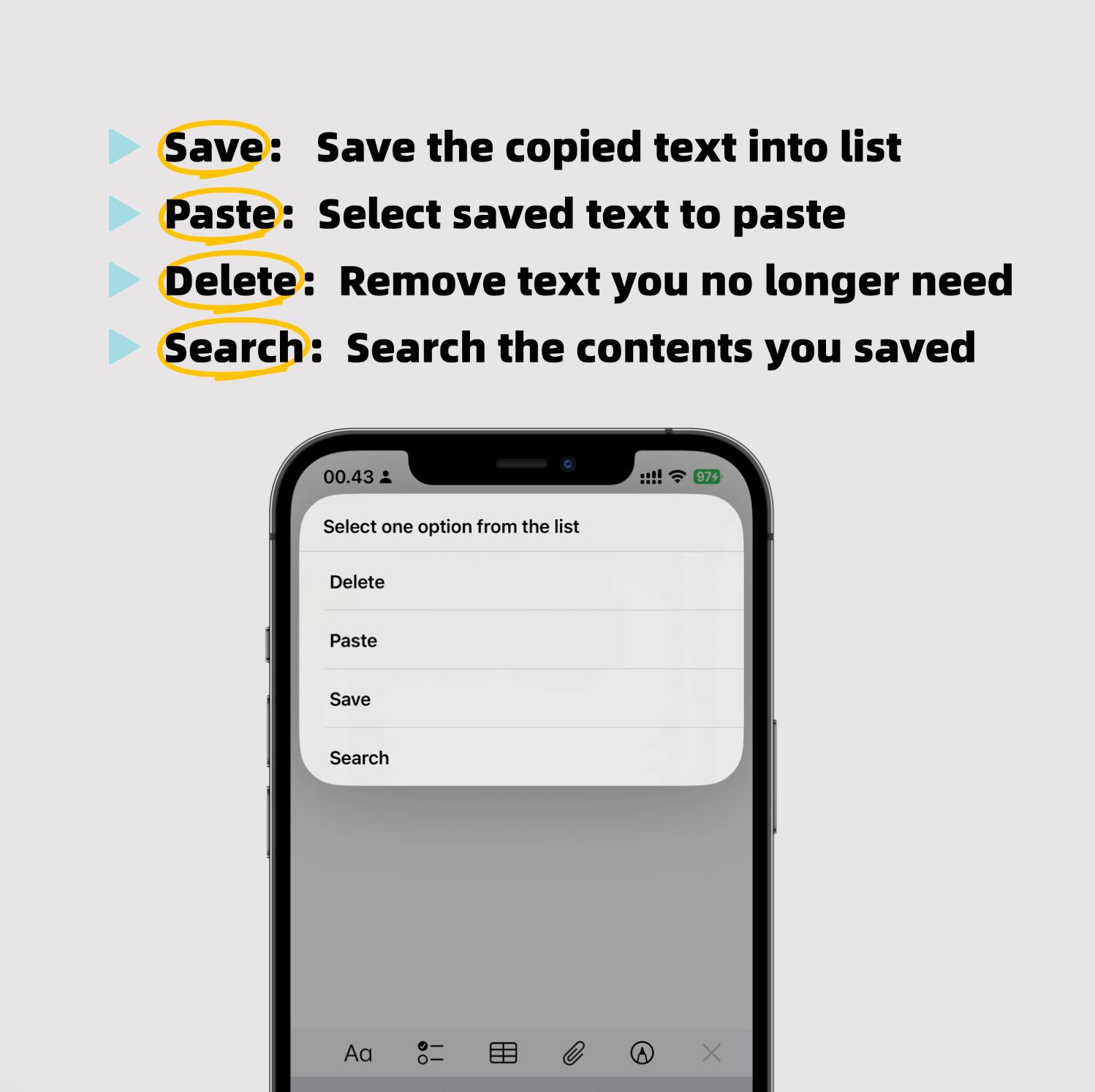 Copy any text,Run the shortcut,Choose Save, Paste, Delete or Search